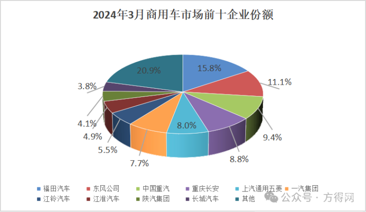 從市場份額來看,銷量前十企業3月合計份額高達79.1%。排名前五的企業合計份額高達53.1%,占據市場的1/2以上。3月排名前三強的企業是福田汽車、東風公司、中國重汽,三家企業的份額分別為15.8%、11.1%、9.4%。