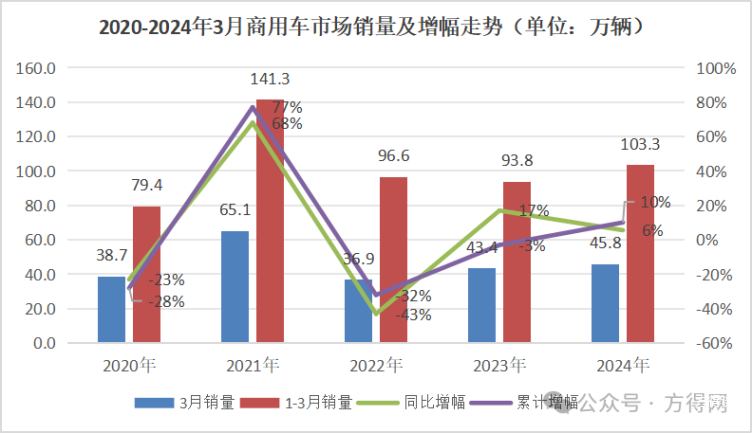 由近五年3月商用車銷量及增幅走勢圖可見,商用車市場走出降、增、降、增、增走勢,其中,2020年、2022年的3月均下降,其中2022年為近五年降幅最大年份,銷量僅為36.9萬輛;2021年、2023年、2024年,這三年的3月均呈現正增長,2021年3月商用車銷量65.1萬輛,其銷量成績為近五年3月的第一位;2024年3月商用車銷量45.8萬輛,其銷量成績為近五年3月的第二位。