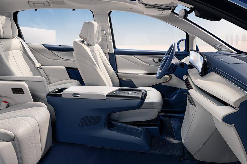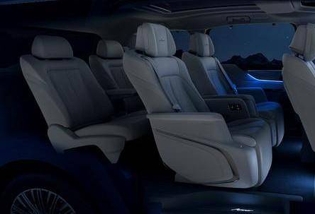 從官圖來看,新車內飾的顏色搭配與世紀同步,寶藍色+米白色的組合確實能帶來很不錯的高級感。另外,中控臺上氛圍燈布局得恰到好處,而門框以及座椅底下也有腳步照明燈。新車將會提供6座和7座可選,其中6座版本的第三排依舊為兩張獨立的座椅,這一點值得點贊,而7座版本的第三排則支持電動翻折功能。