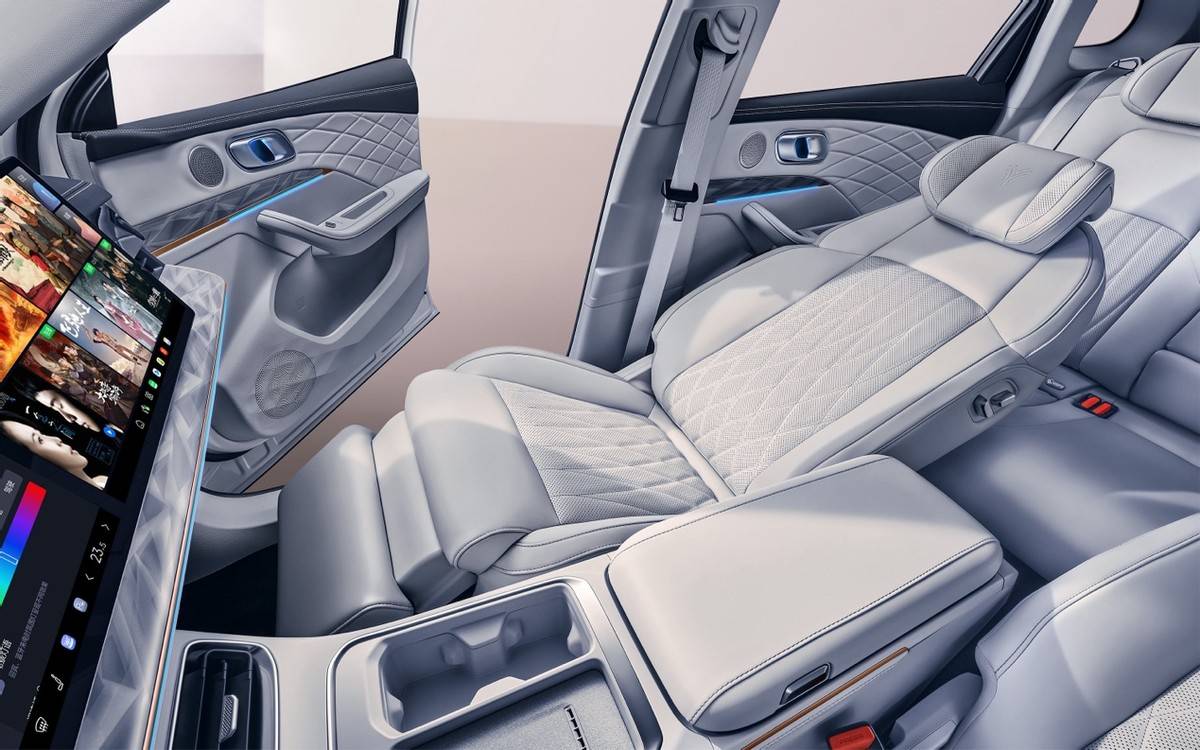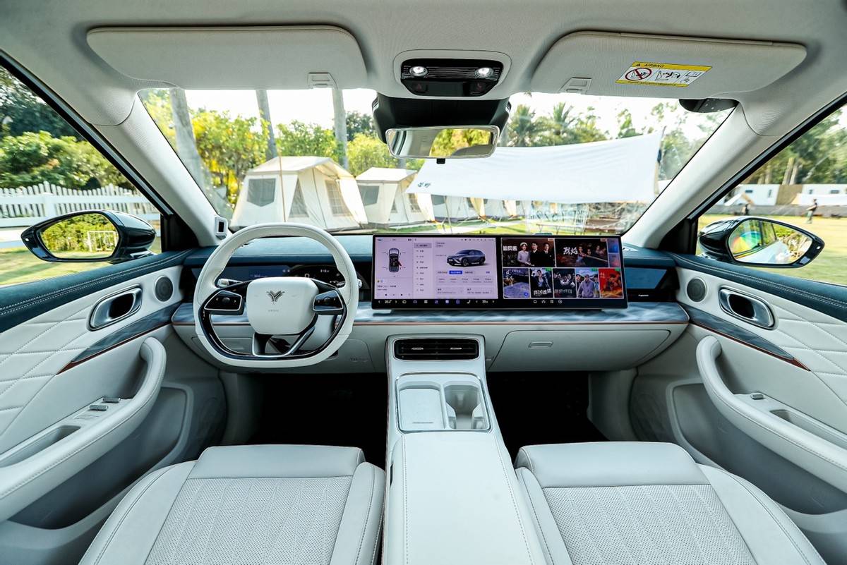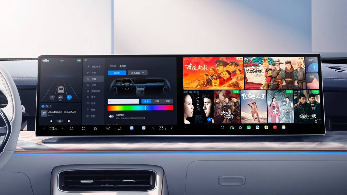 哪吒L的車內空間采用360°環抱式座艙設計,配合大量軟質內飾、隱藏式儀表屏、雙15.6英寸超窄邊全高清屏“大彩電”。采用高通驍龍8155P高性能芯片,京東方LTPS高端屏擁有1920*1080 FHD全高清分辨率,6.7mm窄邊、12mm極致輕薄,鋁鎂合金邊框,兼顧性能、良好的觀看效果和觸感。