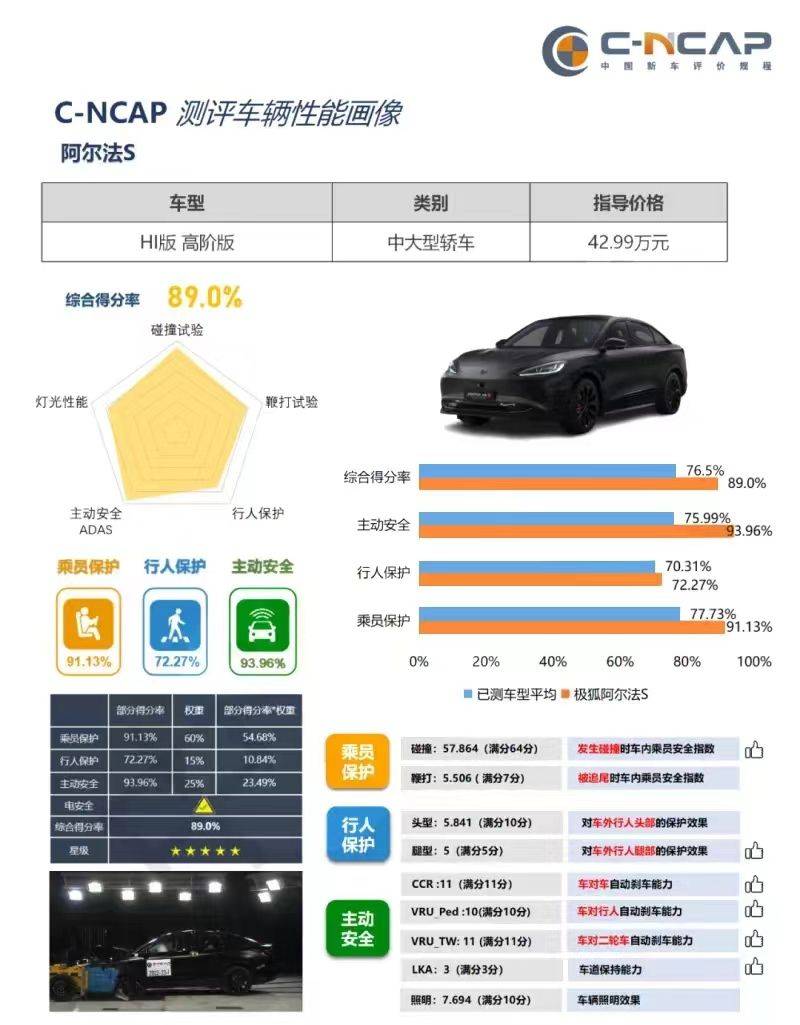 優秀用實力說話,阿爾法S先行版也獲得行業多次權威評測認可,中汽研2021版C-NCAP得分行業第一,“五星級”安全評價、中汽研2022年度五星健康車、中汽中心汽車測評管理中心行車輔助超5星認證,首批測試車型總成績第一。