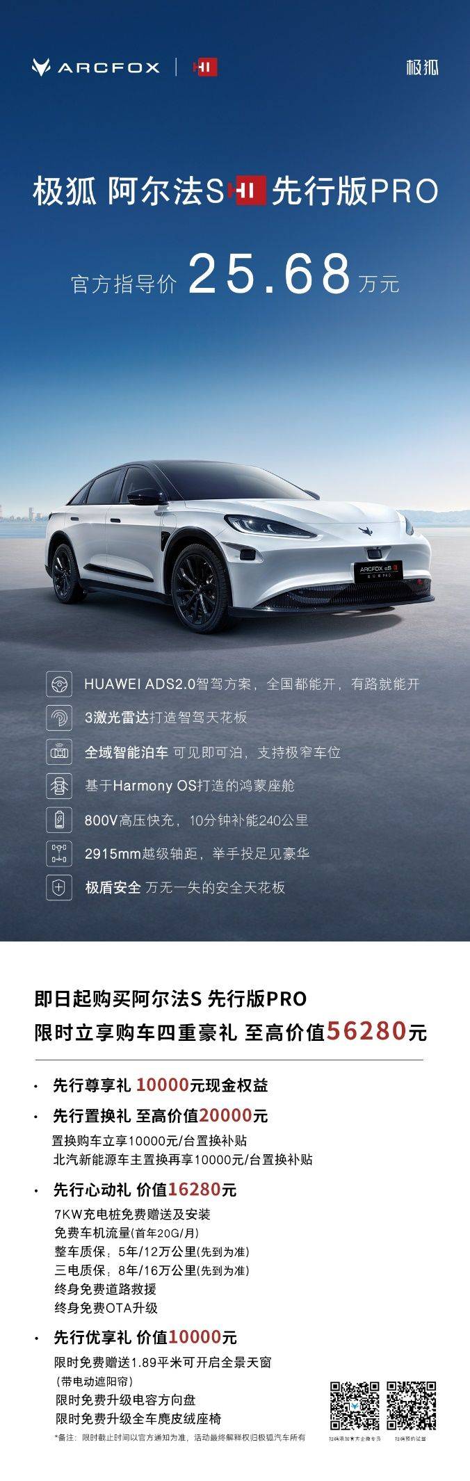 4月25日,極狐阿爾法S先行版PRO在北京車展正式上市,官方指導售價為25.68萬元。同時,還限時推出了四重豪禮,綜合優惠近56280元,其中現金優惠1萬元,這意味著只需24.68萬元即可擁有高階智能豪華純電轎車,更有置換車主享最高20000元優惠,最低可達22.68萬。相較市面上其他帶激光雷達的車型基本都在26萬以上,這款車可以稱之為 “最具產品競爭力的高階智駕產品”。