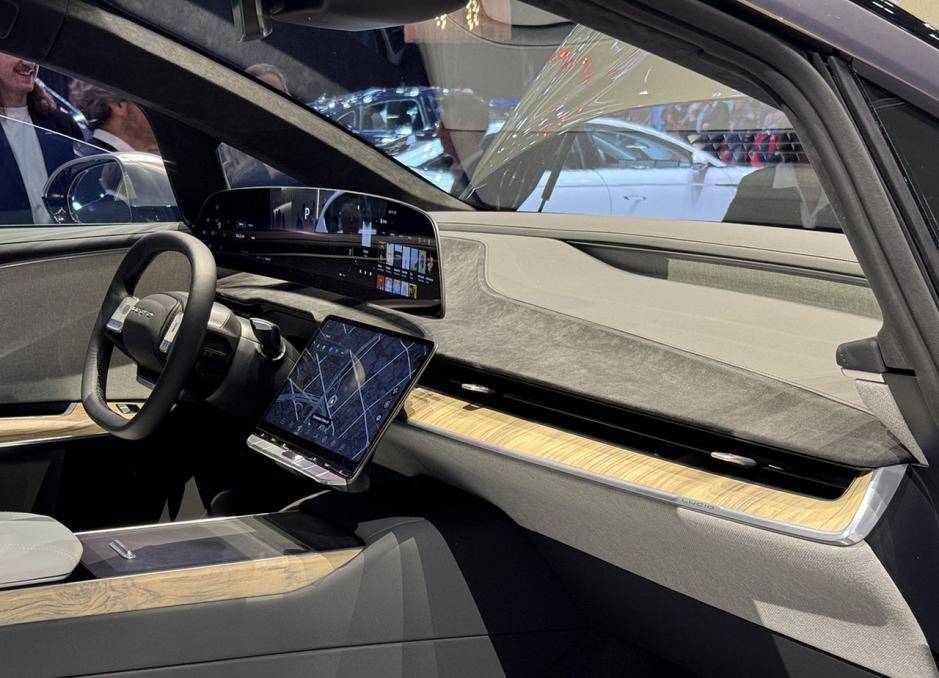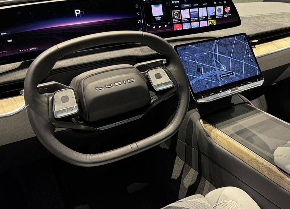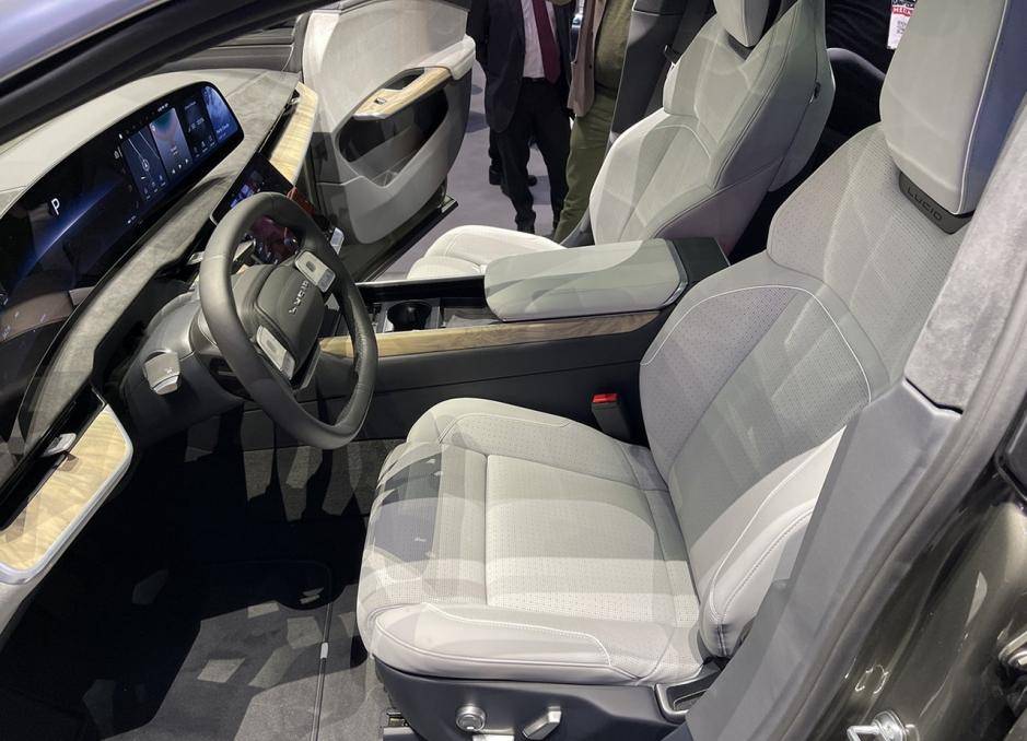 側(cè)面來看,車身比較長,畢竟它是一款七座車,軸距為119.5英寸,內(nèi)部空間很大。整車車頂設(shè)計平直,給人一種旅行車的感覺,輪轂也是五輻式結(jié)構(gòu),看起來很有活力。尾部有貫穿式燈組,上面是類似于擾流板的設(shè)計,LUCID字母提升了新車的辨識度,整個尾部觀感上并不單調(diào)。