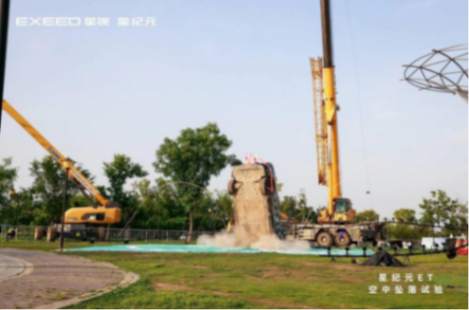 拋開那些紙上談兵式的安全功能,星紀元ET可謂親身實踐了一把什么叫做真正的安全硬核。沒錯,在5月6日剛剛結束的空中墜落試驗中,星紀元ET從31.9米的高空“自由落體”,車輛保持豎直碰撞且處于上電狀態,車頭與地面4厘米厚鋼板100%重疊正碰,瞬時碰撞速度高達90km/h,碰撞能量超過行業標準3.24倍。