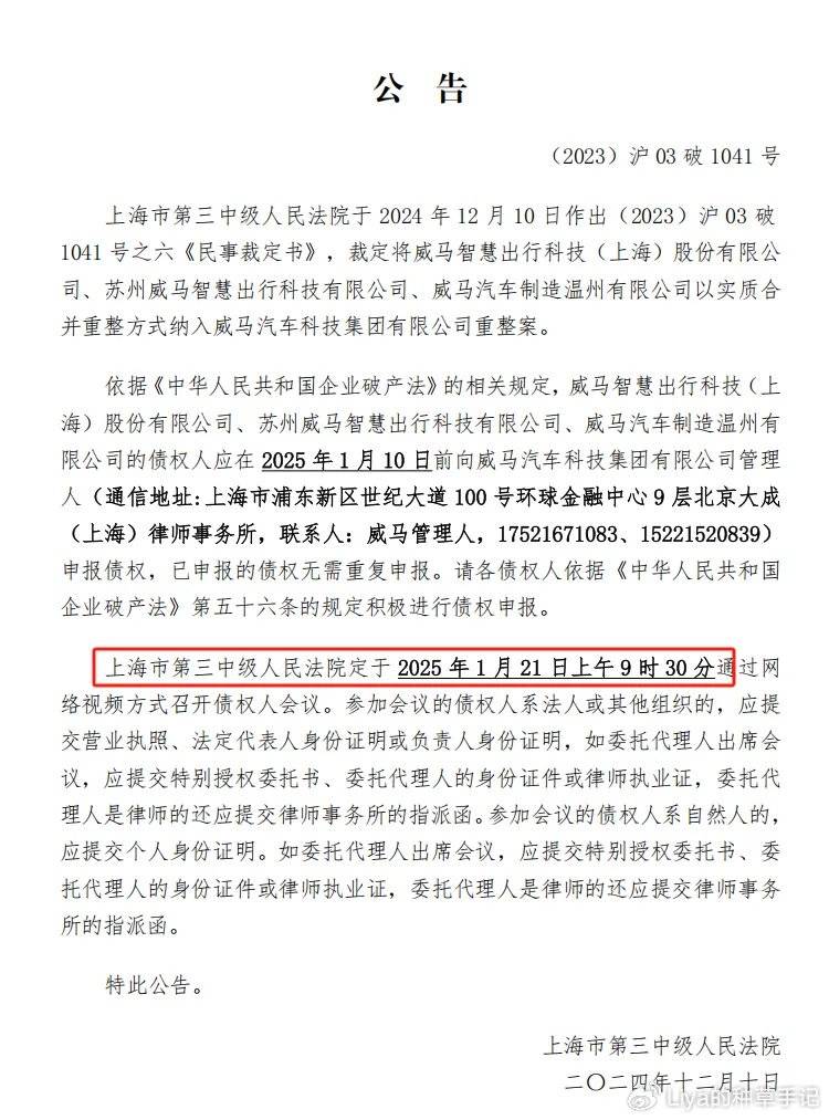 ▲圖源:上海市第三中級(jí)人民法院發(fā)布召開(kāi)威馬汽車債權(quán)人會(huì)議的公告終于,2025 年 1 月 21 日,有消息傳來(lái):威馬汽車再次召開(kāi)債權(quán)人會(huì)議,會(huì)議內(nèi)容包括債權(quán)核查、管理人工作報(bào)告,還有重整計(jì)劃的審議表決。這個(gè)草案的目標(biāo)可是相當(dāng) “宏偉”:2025 年完成復(fù)工復(fù)產(chǎn),同時(shí)進(jìn)行品牌煥新和營(yíng)銷網(wǎng)絡(luò)的構(gòu)建;2026 - 2027 年加大研發(fā)投入,要實(shí)現(xiàn)年銷量超過(guò) 60 萬(wàn)輛的目標(biāo);2028 - 2029 年向全球投放 10 款新車型,年銷量目標(biāo)超過(guò) 100 萬(wàn)輛,營(yíng)收突破 1100 億元,估值達(dá)到 1500 億元以上。 要知道,威馬最輝煌的時(shí)候,國(guó)內(nèi)年銷量也才 4.42 萬(wàn)輛,現(xiàn)在都破產(chǎn)了,還想著一年賣 100 萬(wàn)輛,真的不是在做夢(mèng)嗎?消息一出,便引來(lái)網(wǎng)友紛紛吐槽。