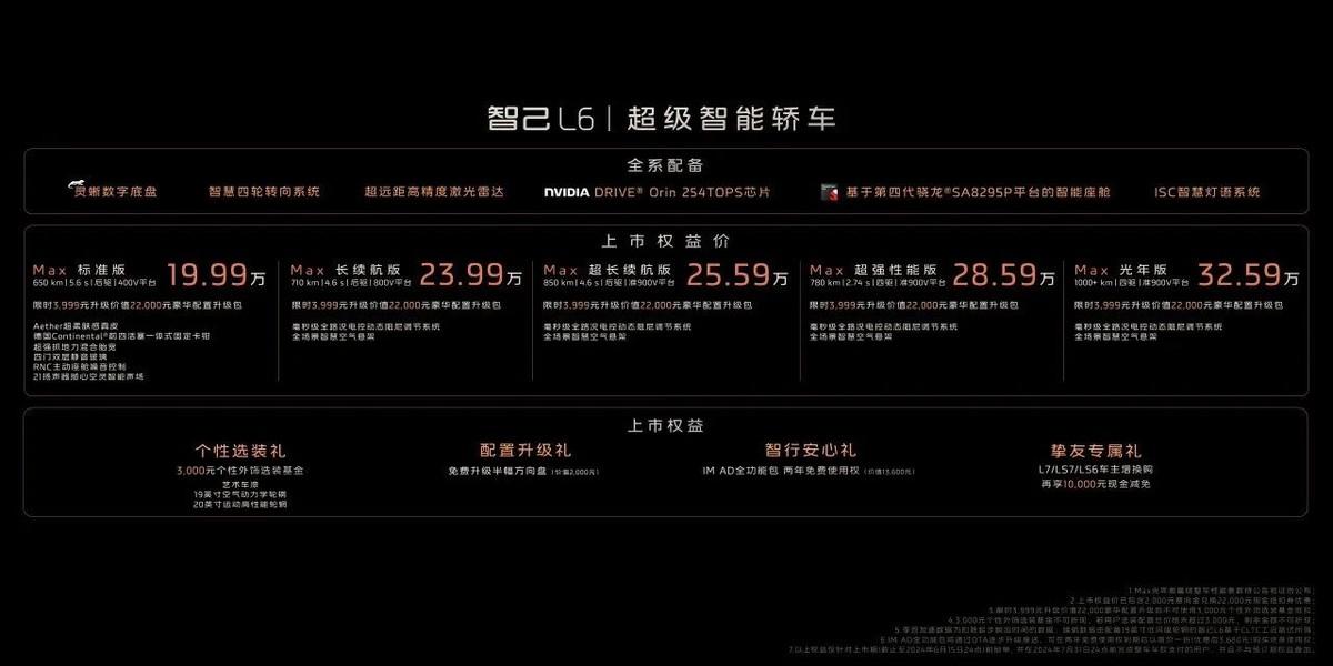1,智己L6起售價是21.99萬,前期權益是減20000,入門19.99萬,比小米SU7價格確實要實在一些,但是智己L6的車型上不夠精簡,已上市是4個版本,還有一個固態電池光年版9月份上,總共是5個配置,我個人感覺次低配25.99萬那個MAX長續航可以取消,這樣消費者很容易記住你的車是75度電和100度電,400V和準900V,中間多一個800V平臺,還是83度電,增加消費者選擇難度,你們說呢?