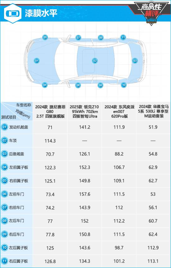 在漆膜水平環節,從測試結果來看,領克Z10表現更加亮眼,整車漆膜平均厚度在測試過的車型中處于中上游水平,同時噴涂均勻性也優于另外三款車。捷尼賽思G80和東風奕派eπ007的漆膜厚度均達到中游水平,前者噴涂均勻性表現稍遜于后者。相比之下,華晨寶馬5系不僅整車漆膜厚度在四款車中墊底,漆膜噴涂均勻性也存在提升空間。