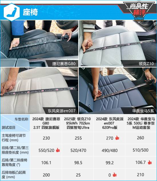 座墊長度方面,捷尼賽思G80的前后排座椅座墊長度均達到同級別上游水平,能夠提供充足的腿部支撐。相比之下,領克Z10的后排座椅座墊長度略短,駕乘人員長時間乘坐容易產生疲勞感。