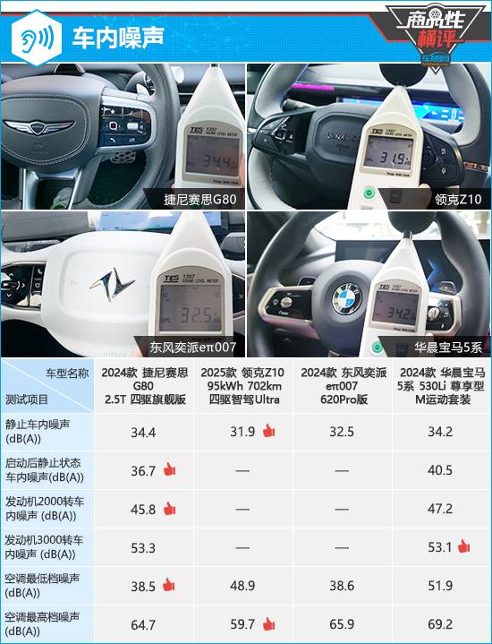 經實測,在靜止狀態下,領克Z10對于車外噪聲隔絕相對出色,實測噪聲值為31.9dB,接近測試儀器的最低值30dB。由于領克Z10和東風奕派eπ007采用電動機驅動,因此車輛啟動后不會出現明顯的噪聲。對于捷尼賽思G80和華晨寶馬5系兩款燃油動力車型來說,發動機在怠速和2000轉時,前者成績相對較好,而當發動機處于3000轉時,后者表現更好。