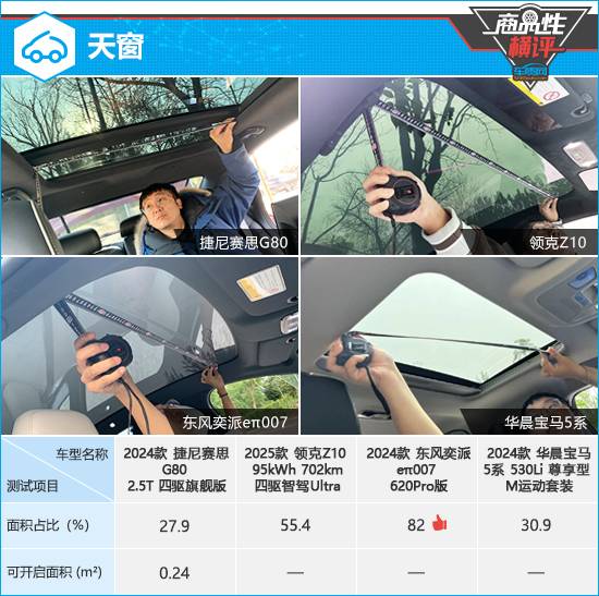 在針對天窗的測試中,捷尼賽思G80配備可開啟全景天窗,其余三款車均配備不可開啟全景天窗。具體尺寸來看,根據已有測試數據,東風奕派eπ007的天窗采光面積較大,能夠為車內乘員帶來更好的通透性。