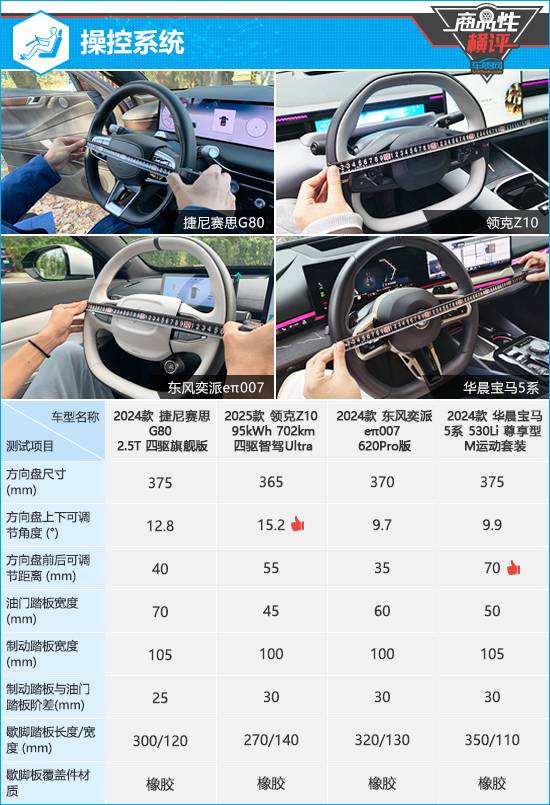 在操控系統方面,捷尼賽思G80和華晨寶馬5系的方向盤尺寸相對適中,可兼顧操控穩定性和靈活性,其余兩款車的方向盤尺寸略小。方向盤調節方面,領克Z10上下可調節角度領先于另外三款車,華晨寶馬5系則在前后調節距離方面占據明顯優勢。