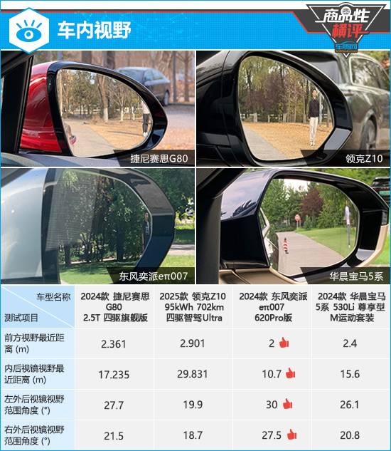 在外后視鏡視野范圍測試中,東風奕派eπ007的兩側外后視鏡測試成績均達到同級別上游水平。相比之下,領克Z10的左側外后視鏡測試成績未達到同級別平均水平,存在一定的視野盲區。