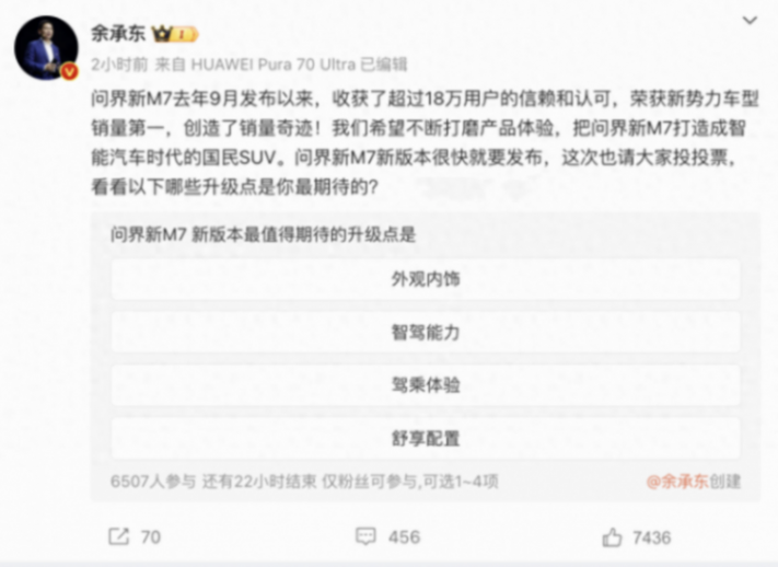 余承東發(fā)文表示,全新問界M7很快就要發(fā)布,并發(fā)起投票,讓讀者選擇期待的升級點。那么,新車會是什么樣子呢?
