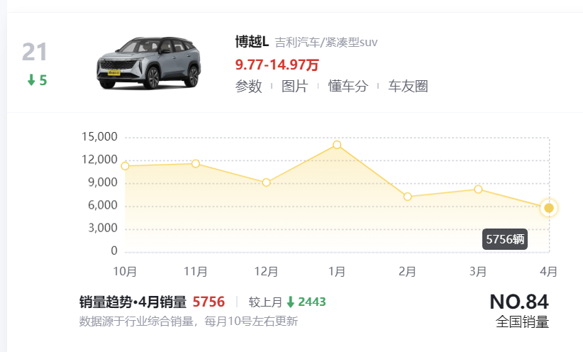 從銷量來看,吉利博越L4月份售出5756輛,在緊湊型SUV里,排在第21名。競(jìng)品車型包括比亞迪宋Pro DM-i、哈弗H6、長(zhǎng)安CS75 PLUS、鋒蘭達(dá)等。
