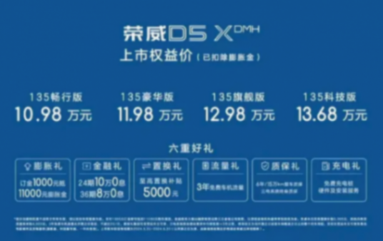 5月20日,上汽榮威D5X DMH正式上市,官方指導價區間為11.98萬-14.68萬元,與預售價一致。即日起至6月30日下訂,可享訂金1000元抵1.1萬元膨脹禮,相當于優惠1萬元,優惠后售價區間為10.98萬-13.68萬元。