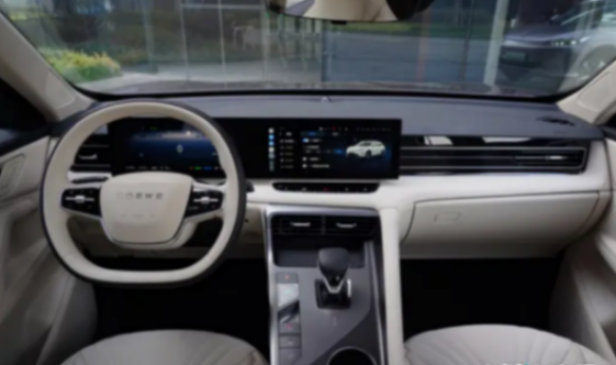榮威D5X DMH車內搭載12.3英寸全液晶儀表+12.3英寸中控屏,內置斑馬車機系統,支持手機/車機導航無縫流轉、導航一鍵映射、充電規劃等功能。屏幕下方采用物理按鍵,前排配備一體化座椅,搭載雙幅多功能方向盤,內飾面板及座椅使用大面積麂皮面料。