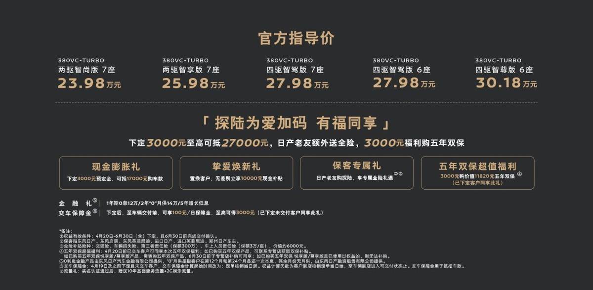 是的,你沒看錯(cuò):即使是探陸頂配版車型的價(jià)格,也低于了漢蘭達(dá)380T的入門版,誠(chéng)意夠不夠?……然而,更大的驚喜還在后面——目前,東風(fēng)日產(chǎn)廠方還推出了“探陸為愛加碼,有福同享”限時(shí)優(yōu)惠活動(dòng):購(gòu)車用戶下定3000元,至高可抵2.7萬(wàn)元!