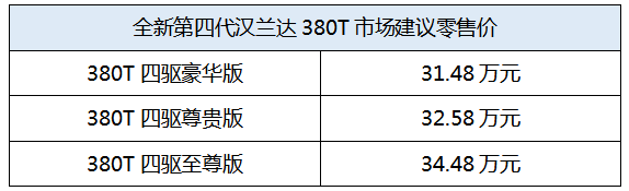 有朋友可能會(huì)想:產(chǎn)品力全面領(lǐng)先,價(jià)格應(yīng)該也會(huì)貴一些吧?……實(shí)際上,情況與此恰恰相反——目前,漢蘭達(dá)380T共有三個(gè)版本可選,其建議零售價(jià)區(qū)間為31.48-34.48萬(wàn)元;探陸則有五個(gè)版本可選,其廠方指導(dǎo)價(jià)區(qū)間僅為23.98-30.18萬(wàn)元。