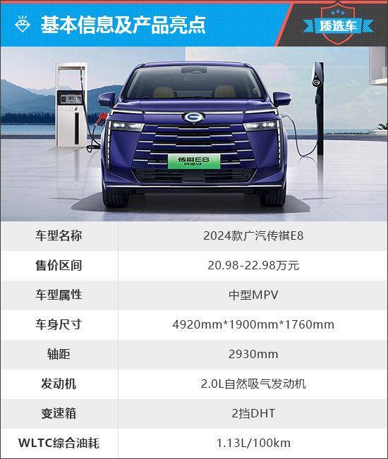 廣汽傳祺E8是傳祺“E系列”的第三款車型,定位插電混動中型MPV。新車以新能源、智能化、大空間等優勢,全面滿足中國家庭的用車需求。目前,新車推出2款車型,售價20.98萬元和22.98萬元。