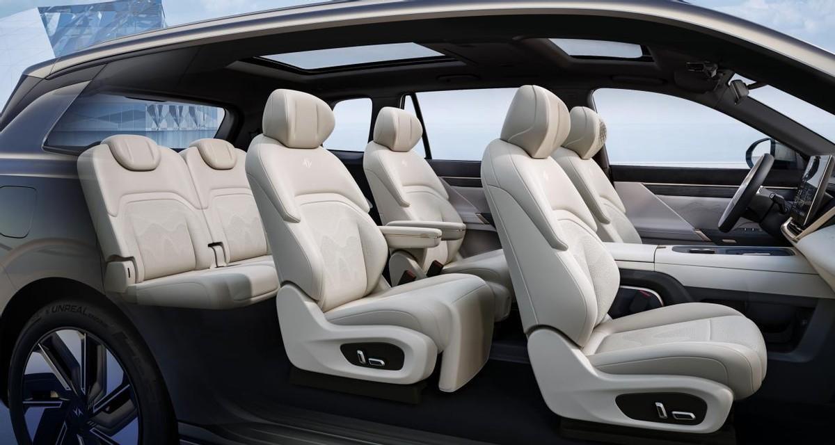 座艙方面,該車采用三排六座布局,用戶可自定義調(diào)整為 5 座或 4 座布局,提供零重力座椅。該車采用有機(jī)硅軟包嬰兒級(jí)環(huán)保座艙,配備雙層夾膠隔音玻璃 MAX,全車標(biāo)配 20 揚(yáng)聲器。此外,該車前排配備 15.6 英寸高清中控屏、9.2 英寸高清流媒體后視鏡,后排配備 15.6 英寸生態(tài)大屏。