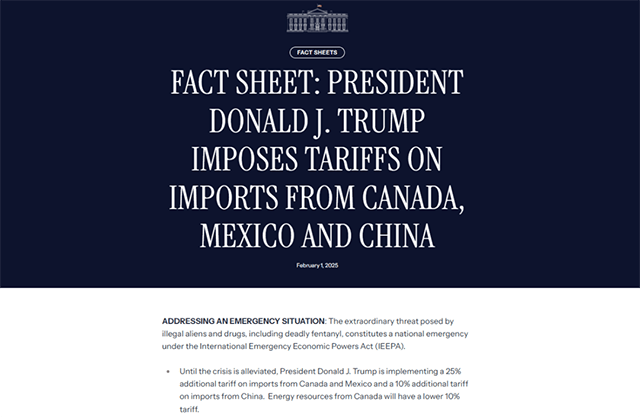 1月31日,美國總統(tǒng)川普表示,自2月1日起對前三大貿(mào)易伙伴墨西哥、加拿大和中國,分別加征25%、25%和10%關(guān)稅。