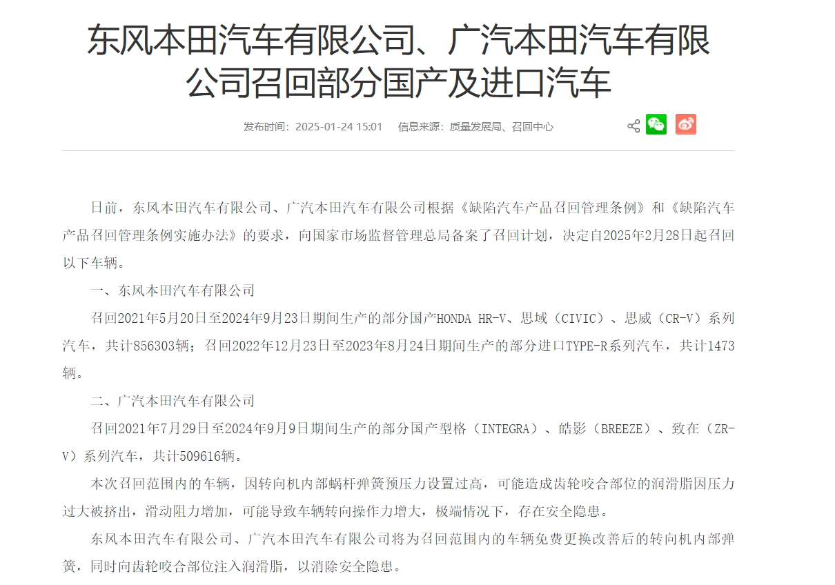無獨有偶,在中國市場,本田也將進行大規模召回。就在不久前,國家市場監督管理總局發布的消息顯示,從2025年2月28日起,本田將會在國內車市召回136萬余臺車輛。