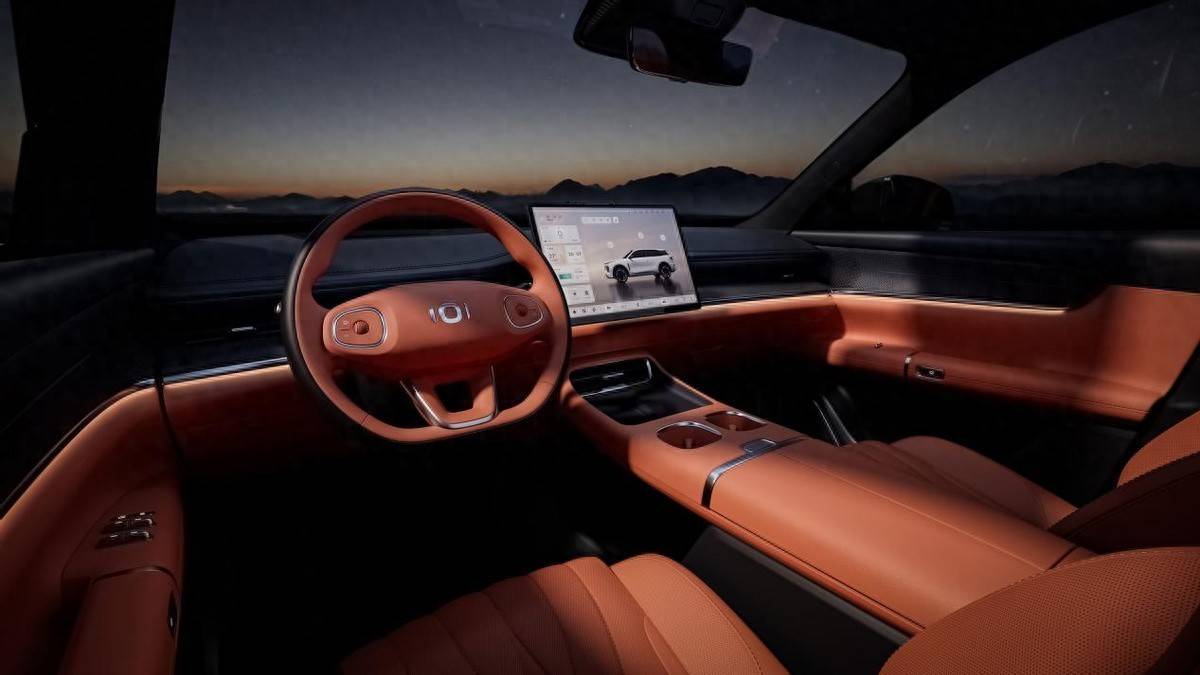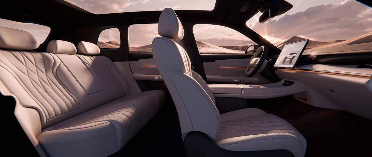 車內部分,給人簡約大氣的印象,整個中控層次分明,軟料運用非常多,并且加入鍍鉻飾條貫穿中控延伸到側門。中控并沒有搭載儀表盤功能,皮質包裹的三輻式方向盤握感估計不錯,上面的物理按鍵是內部少有的運用了。中控部分除了能左右角度調節的懸浮大屏,還在化妝鏡部分有著12.8英寸娛樂屏功能。