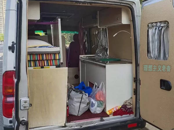 車內(nèi)后面右側(cè)放置的是一張櫥柜,上面有自來水和電磁爐,下面有炊具和食材,自駕游途中隨時可駐車做飯。