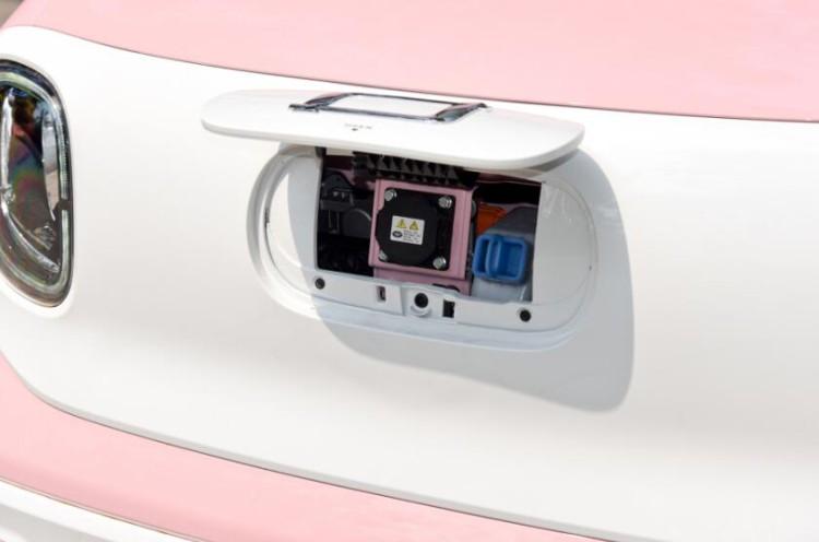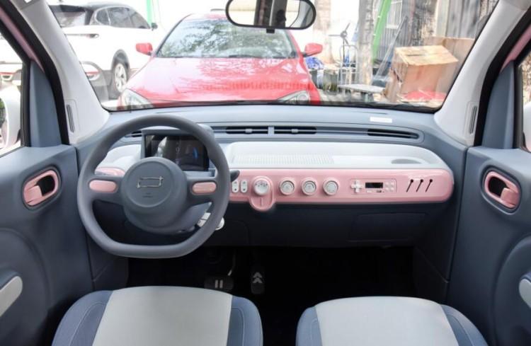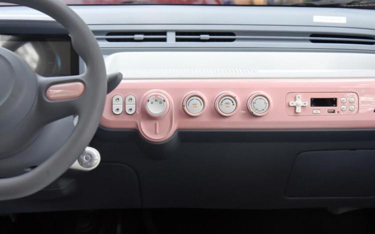 車內同樣是可愛路線,粉白配色會很符合年輕女性的喜好。車內配備了雙輻式方向盤和液晶儀表,中控臺位置設有車窗升降按鍵、旋鈕式電子擋桿、以及空調、收音機等控制按鈕。