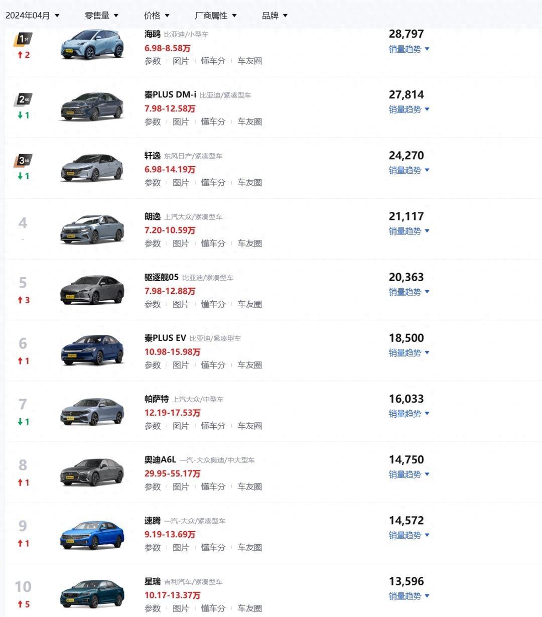 打2024年開年,不少車企就打響了力度更大的價格戰,798的秦子、998的銀河L6、14萬的天籟、18萬的奧德賽……但從銷量上來說,通過降價實現銷量立竿見影的車型可并不多。根據4月份轎車銷量榜來看,前十名中比亞迪占了四個席位,其中海鷗、秦PLUS DM-i、驅逐艦05單月銷量過兩萬,三臺車加起來已經超過不少品牌的單月銷量了。