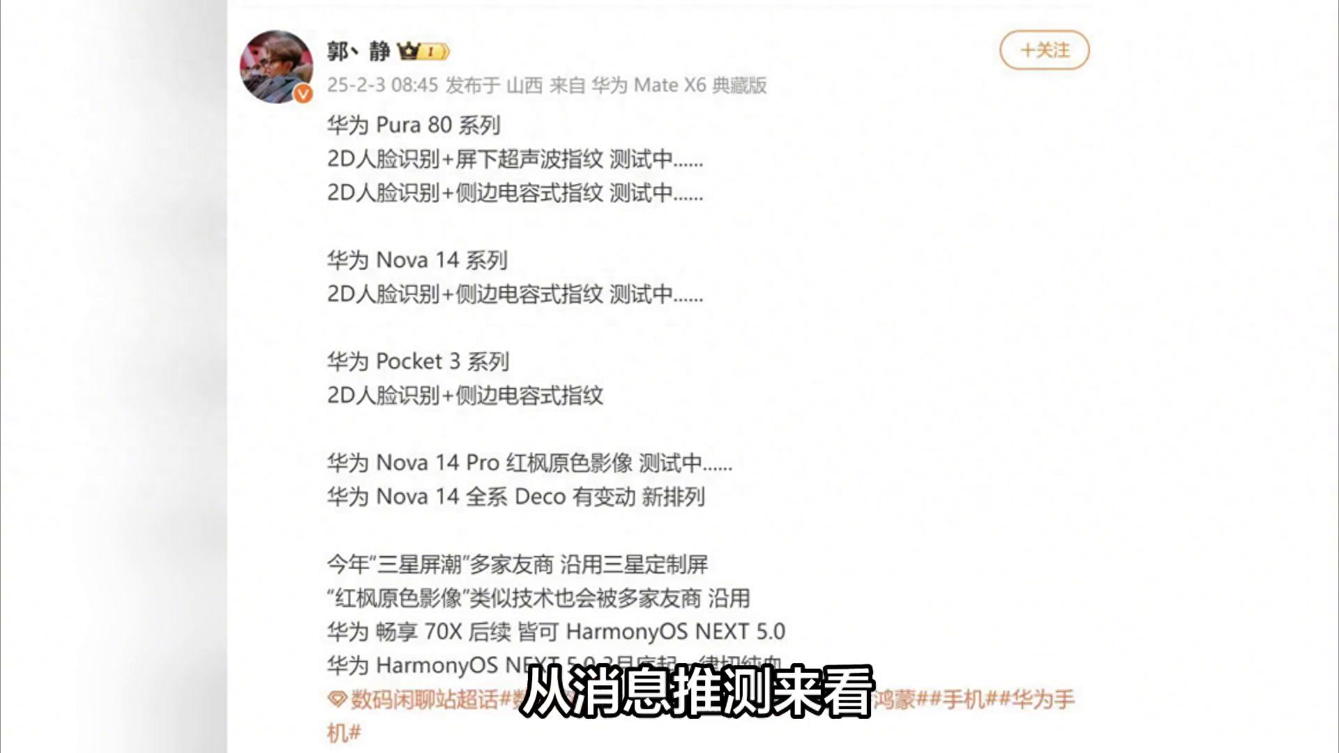 近日,有關華為2025新品的消息在網絡上引起了廣泛關注。據博主爆料,華為即將推出的Pura80系列將采用新的生物識別方案。目前有兩套方案正在測試中,一套是2D人臉識別+屏下超聲波指紋,另一套是2D人臉識別+側邊電容式指紋。