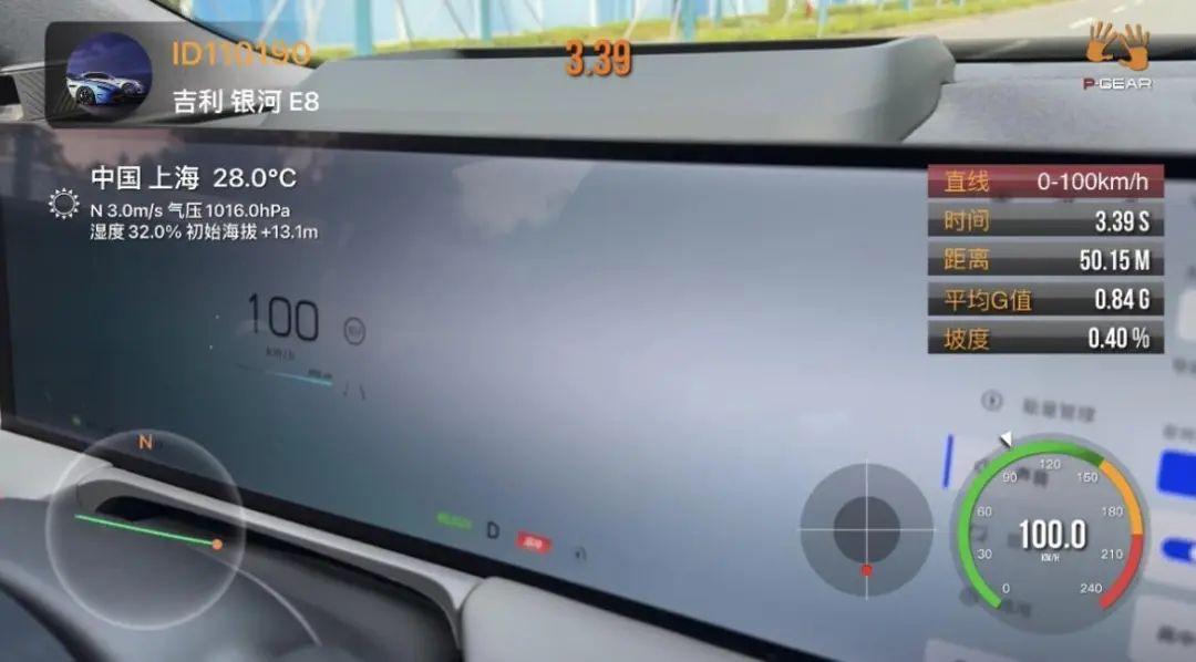 當(dāng)然最直觀能體現(xiàn)性能的測試項目就是零百加速了,在我們的測試下,吉利銀河E8性能版的零百加速竟然超越了官方標(biāo)定的3.49s,達(dá)到了3.39s的好成績,這樣的反向虛標(biāo)誰能不喜歡!