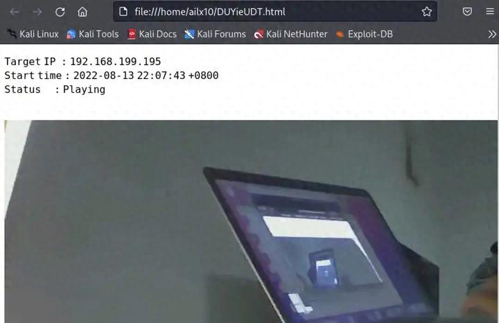 下面是當(dāng)時(shí)實(shí)驗(yàn)時(shí)候的監(jiān)控畫(huà)面,我正坐在電腦前,敲打著我的kali上的滲透測(cè)試工具,經(jīng)過(guò)一連串復(fù)雜的操作,最后當(dāng)我輸入webcam_stream,被監(jiān)控的手機(jī)攝像頭就自動(dòng)打開(kāi)了,而圖片中的Status : Playing 表示這是一個(gè)實(shí)時(shí)監(jiān)控畫(huà)面。