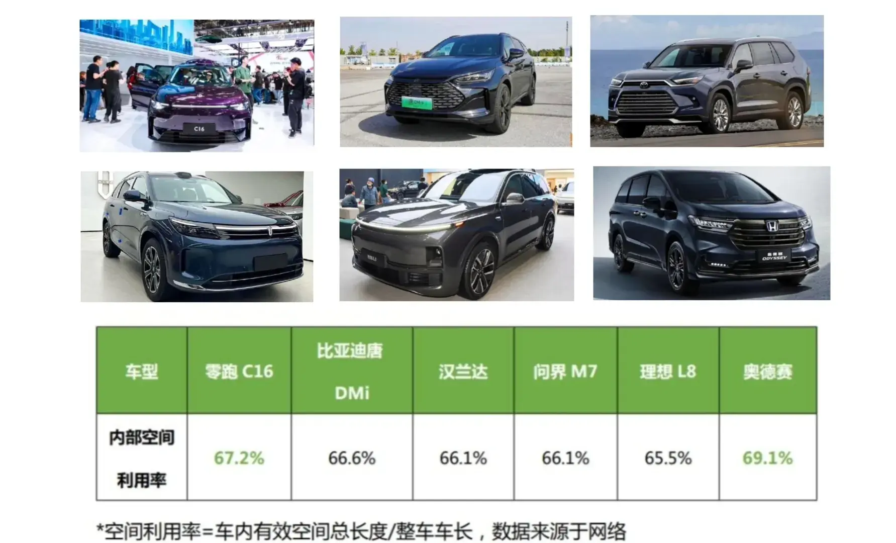零跑C16的內部空間利用率高達67.2%,與市面主流車型相比,比亞迪唐DM-i 66.6%、漢蘭達66.1%、問界M7 66.1%、理想L8 65.5%、奧德賽69.1%,零跑C16的數據表現領先多款同級車型。