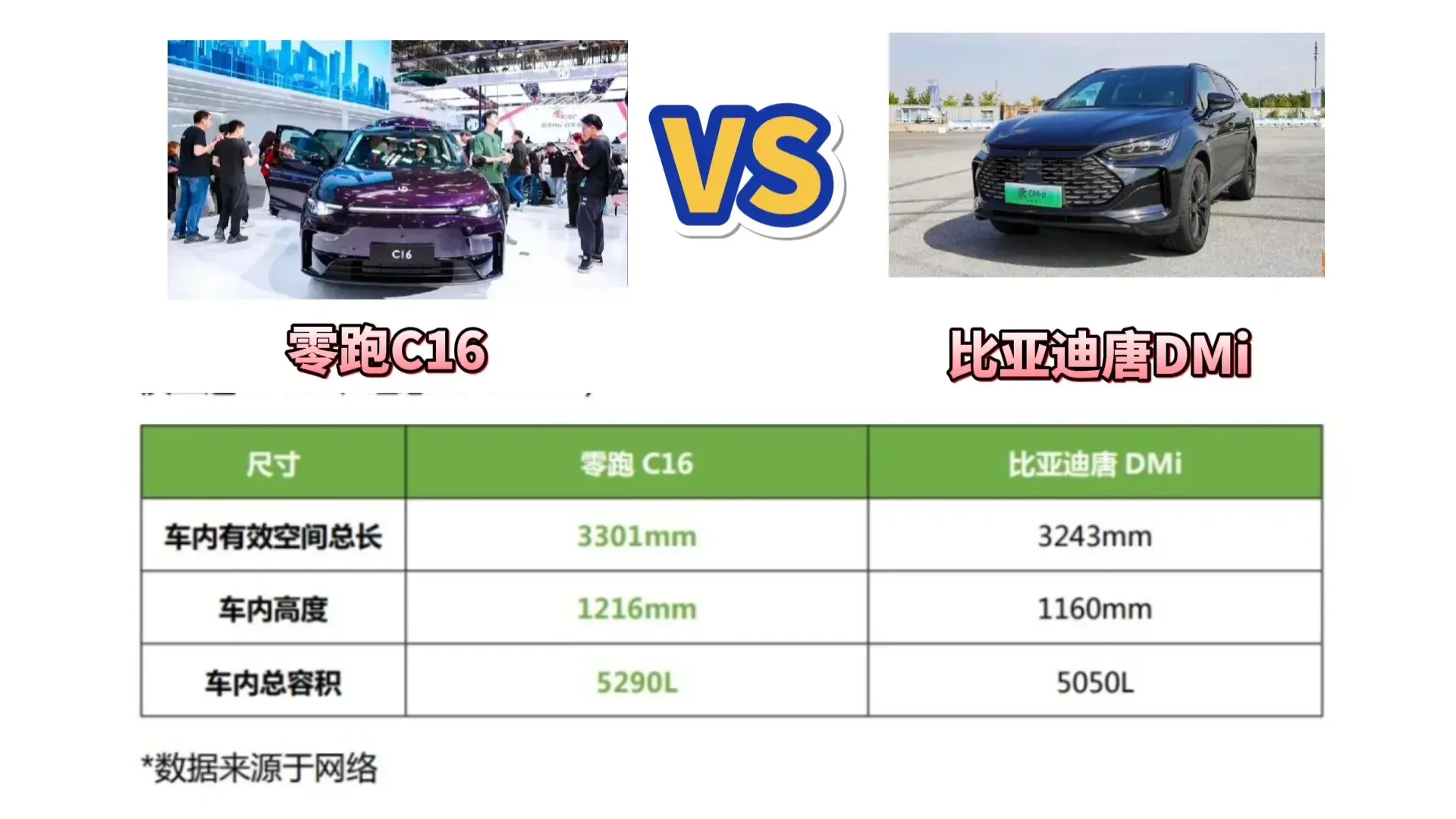 零跑C16車內有效空間總長3301mm,車內高度為1216mm,車內總容積達5290L,對比比亞迪唐DMi的總長3243mm,高度1160mm,容積5050L,處于同級領先水平。