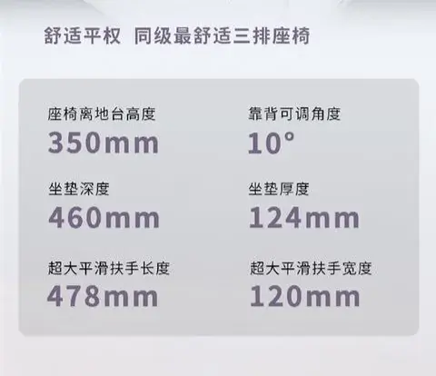 第三排座椅整體橫向寬度為1036mm,坐墊縱向深度為460mm,坐墊厚度為124mm,座椅離地臺高度為350mm,三排腳部空隙高度為95mm,相比同級尺寸上更有優勢。同時,靠背可10度隨心調節,充分保證了坐姿的舒適性。不讓任何一位坐小板凳,真正做到三排舒適平權。