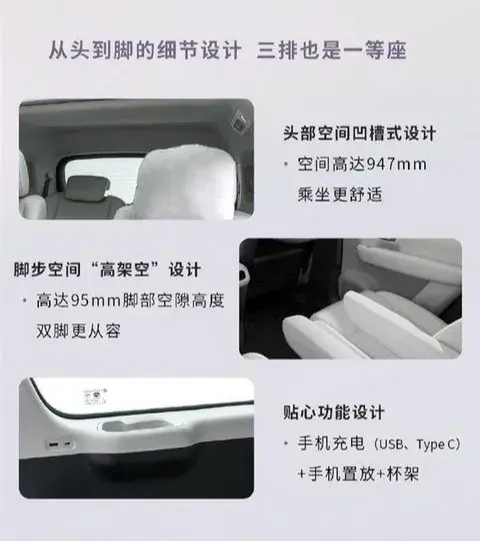 車內配置了多個手機充電接口、手機置放、杯架等實用功能,此外,副駕后側還配備了小桌板,日常使用十分方便。中央通道的寬度達到160mm,無論大人、小孩出入第三排都很便捷。并且,車內二、三排的頭部有效空間表現也遠超同級,舒適性與MPV媲美。