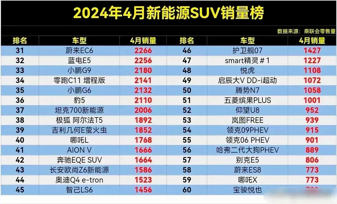 31~60排名,蔚來EC6、藍(lán)電E5、小鵬G9、零跑C11增程版、小鵬G6、豹5、坦克700新能源都在2千多左右。極狐阿爾法T5、吉利幾何E螢火蟲、哪吒L、AION V、奔馳EQE SUV、長安歐尚Z6新能源、智己LS6、護(hù)衛(wèi)艦07、悅虎等都超過1千多輛。仰望U8、嵐圖FREE、領(lǐng)克09PHEV、領(lǐng)克06PHEV、哈弗二代大狗PHEV、別克E5、蔚來ES8、哪吒X、寶駿悅也都在700~900多輛。
