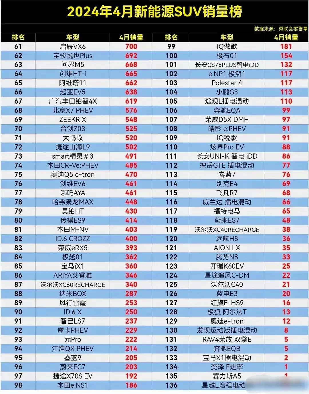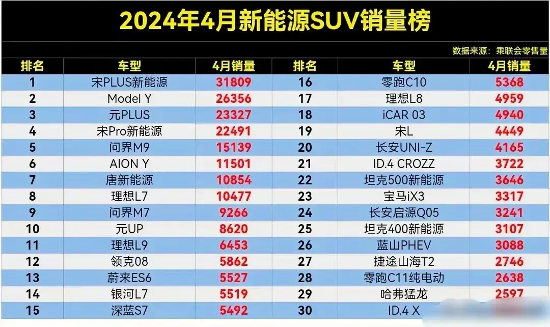 國產(chǎn)新能源汽車發(fā)展的如火如荼,各大車企都鉚足了勁,使出看家本領(lǐng)搶占市場份額,競爭實(shí)在激烈,排行榜又發(fā)生了巨變。從乘聯(lián)會發(fā)布的2024年4月新能源SUV銷量榜來看,數(shù)據(jù)顯示,銷量突破1萬大關(guān)的車型僅有8款,宋PLUS新能源表現(xiàn)堅(jiān)挺,榮獲冠軍,Model y獲得亞軍,元PLUS排在第三名,宋Pro新能源和問界M9都進(jìn)入前五名,AION Y、唐新能源、理想L7、問界M7、元UP都進(jìn)入榜單前十名。太慘了!4月新能源SUV銷量榜,宋PLUS奪冠,問界M9第5,理想L7第8