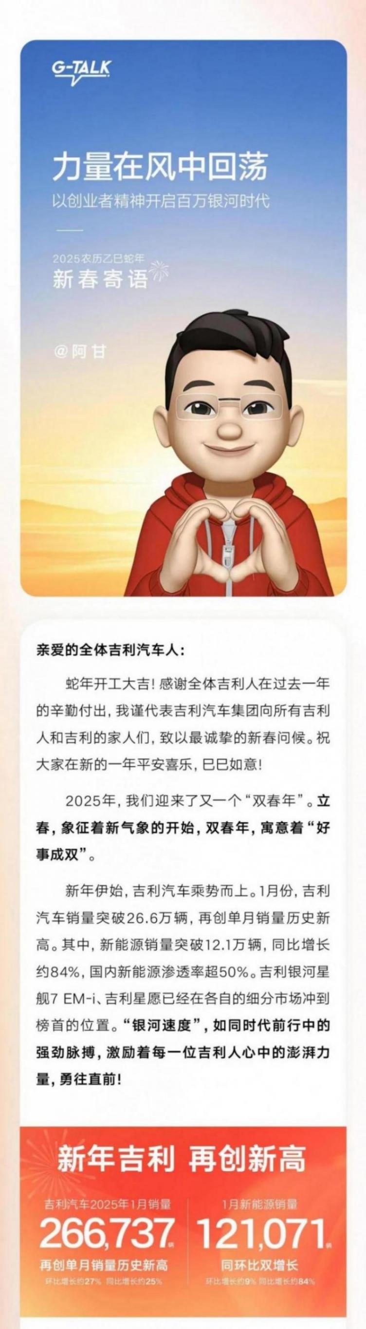 水滴汽車注意到,就在淦家閱發布新年寄語之前,吉利公布了1月銷量,以266,737輛的成績,再創單月銷量歷史新高‌。其中,新能源銷量突破12.1萬輛,同比增長約84%,國內新能源滲透率超50%。