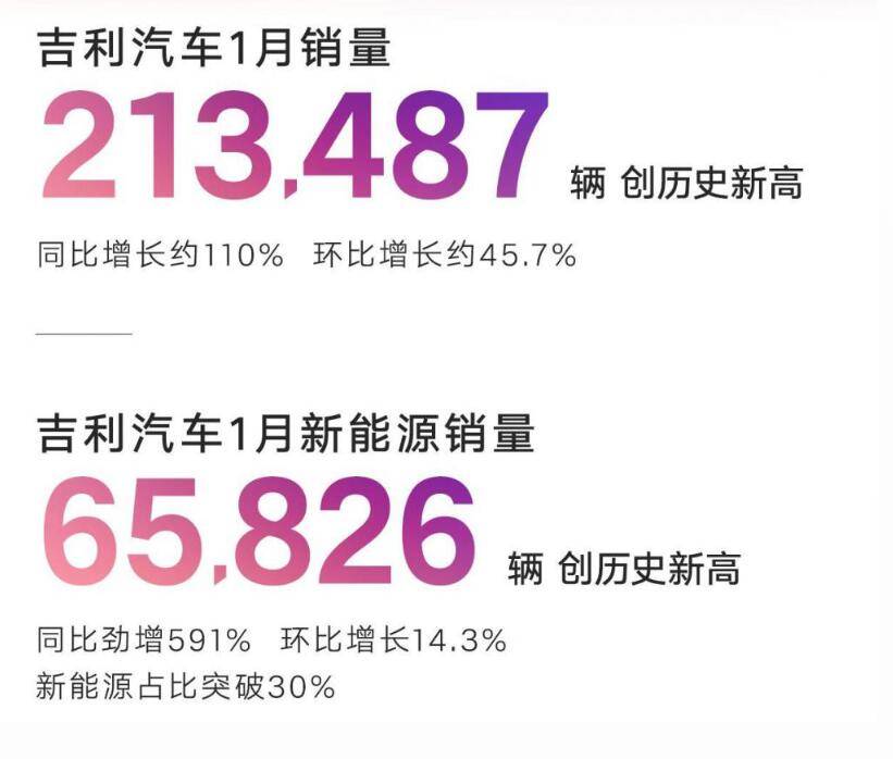 1月銷量/交付量:吉利集團銷量達到213487輛,同比大漲110%