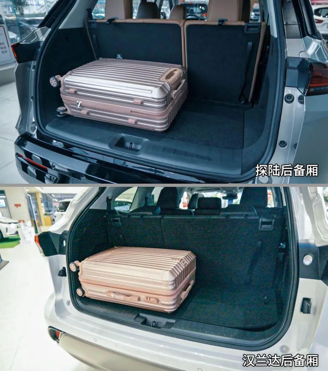 后備廂空間方面,在同樣立起第三排座椅后,漢蘭達與探陸的后備廂空間寬度不相上下,但探陸車身長度更長,所以其進深也稍長一點。