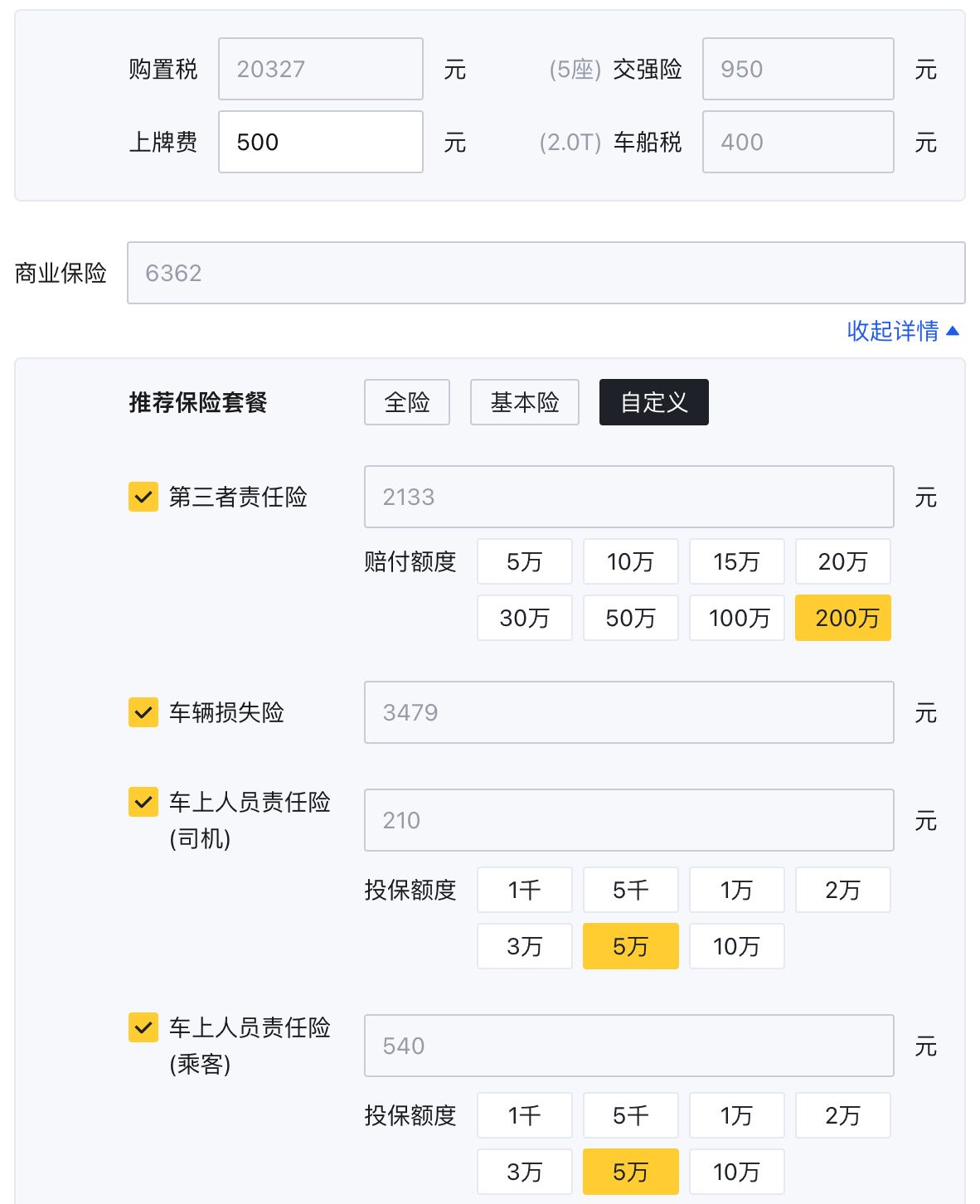 凱迪拉克CT5的保險成本主要包含車船稅、交強險以及商業保險,其中,車船稅為400元/年、交強險為950元/年,而包含200萬第三者責任險、10萬車上人員責任險以及車輛損失險的商業保險則為6362元/年,其中,交強險與商業保險按照首年不出險、次年遞減10%計入,車輛前三年保險成本約為20943元、平均每年約為6981元。