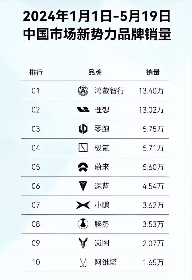 所以,拋開鴻蒙智行看,今年1月1日至5月19日,國產(chǎn)新勢力中,理想汽車近半年銷量13.02萬臺,位列第一。