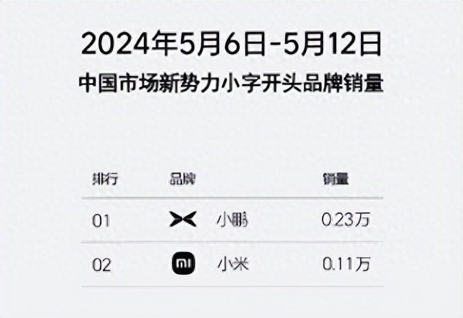 一個是“中國市場新勢力小字開頭品牌銷量”,小鵬以0.23萬臺奪冠,小米排第二,周銷量0.11萬臺,滿足條件的只有這兩個品牌,既是冠軍、亞軍,換種角度看,也是倒數(shù)第一和倒數(shù)第二之間的惺惺相惜。