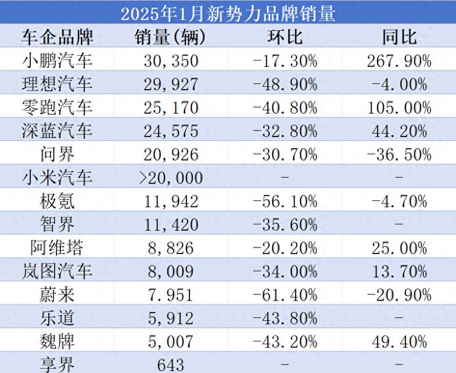 2025年1月整體的銷售排名格局呈現出“大洗牌”的情況。在這其中,小鵬汽車再度殺出重圍,以月銷售3.04萬輛的數據回歸銷量榜首,強勢領跑造車新勢力。