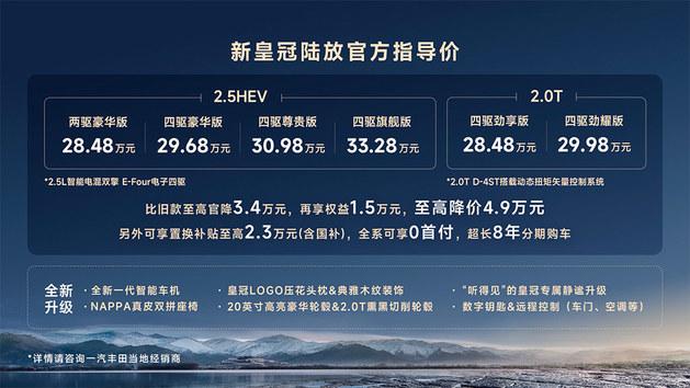 2024年5月30日,一汽豐田新款皇冠陸放上市,售價區間為28.48萬-33.28萬元。此價格比舊款車型最高降4.9萬元,其中,官方最高降幅3.4萬元,另外可再享權益1.5萬元。同時,可享含國補至高2.3萬元置換補貼及0首付至高8年分期購車等多重政策。