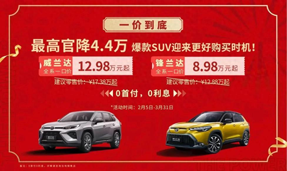 2025年開年第一天最新重磅炸彈消息是來自廣汽豐田的,那就是一口價鉅惠活動開始了,這次威蘭達和鋒蘭達的降價幅度非常大,是消費者上車的最好時機,威蘭達全系一口價12.98萬元起,鋒蘭達全系一口價8.98萬元起。最高官降4.4萬,真的是誠意滿滿。這樣的降價力度能夠顯著提升這兩款車型的市場競爭力,吸引更多消費者的關注和購買。