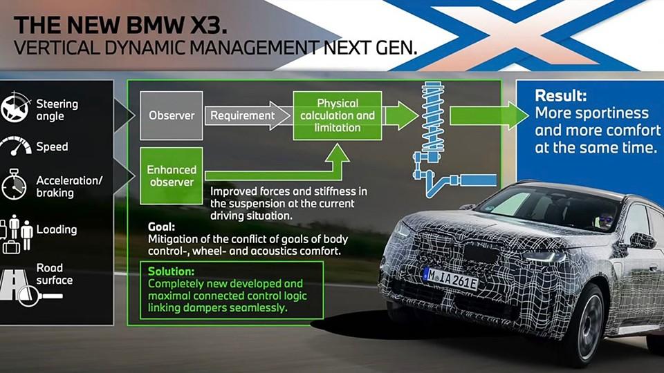 除了國產后的空間表現待定之外,新車的舒適性也并非完全被操控追求所掩蓋。而寶馬平衡操控與舒適的做法,與國內華為、小米等新勢力車企的操作基本一致。即,主動懸架系統。從已經曝光的信息來看,全新一代寶馬X3還是會采用視覺與雷達感知相混合的硬件體系。除了對路面狀況的精確感知,新車還能實現包括倒車AEB在內的安全輔助功能。此外,寶馬的算法還會參考轉向角度、速度、加速以及剎車狀態,以及車輛負載情況。以上這些信息通過計算,最終都會傳遞給懸架,以提供合適的軟硬度。