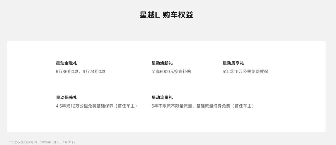 此外根據吉利汽車官網信息顯示,在2024年1月1日至1月31日期間,消費者購買吉利星越L可享有多項權益,包括至高6000元換購補貼、5年或15萬公里免費質保、5年不限流不限量流量以及基礎流量終身免費(首任車主)等。